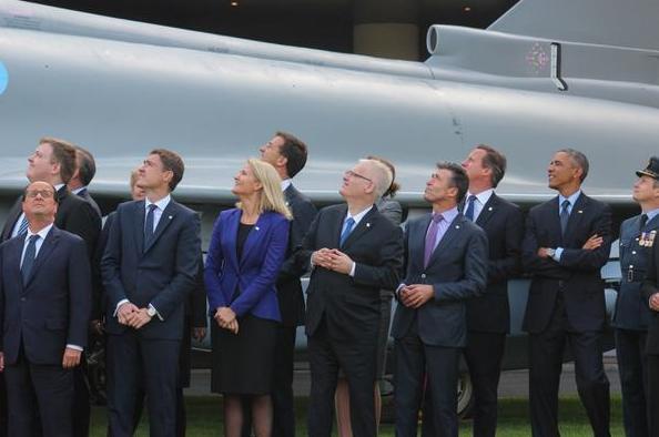 Durante la ultima reunión de jefes de la NATO, en Newport (Reino Unido), los presidentes y jefes de estado miran pasar la patrulla acrobática de la RAF.